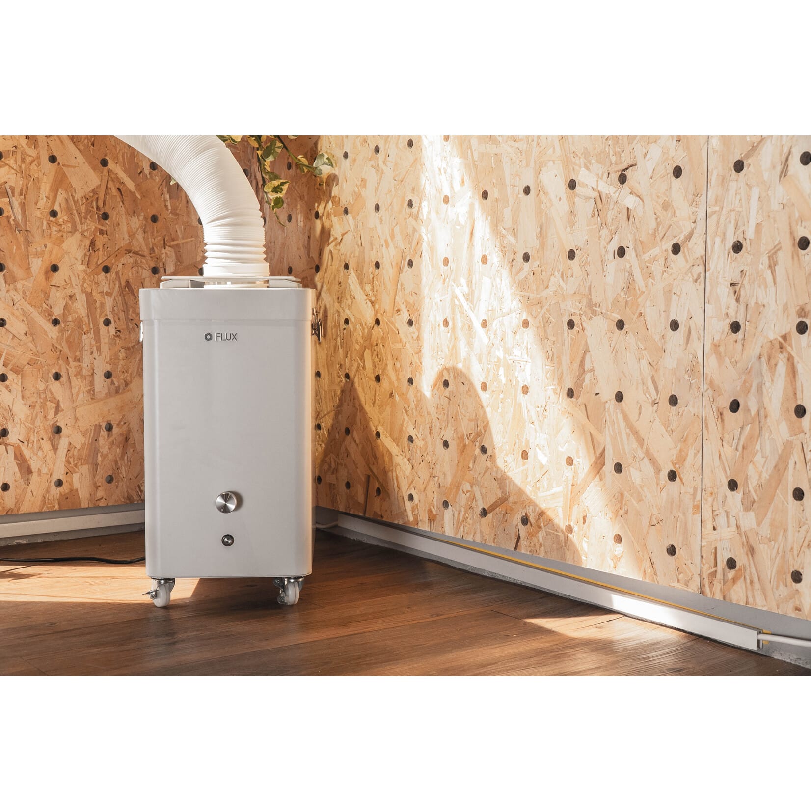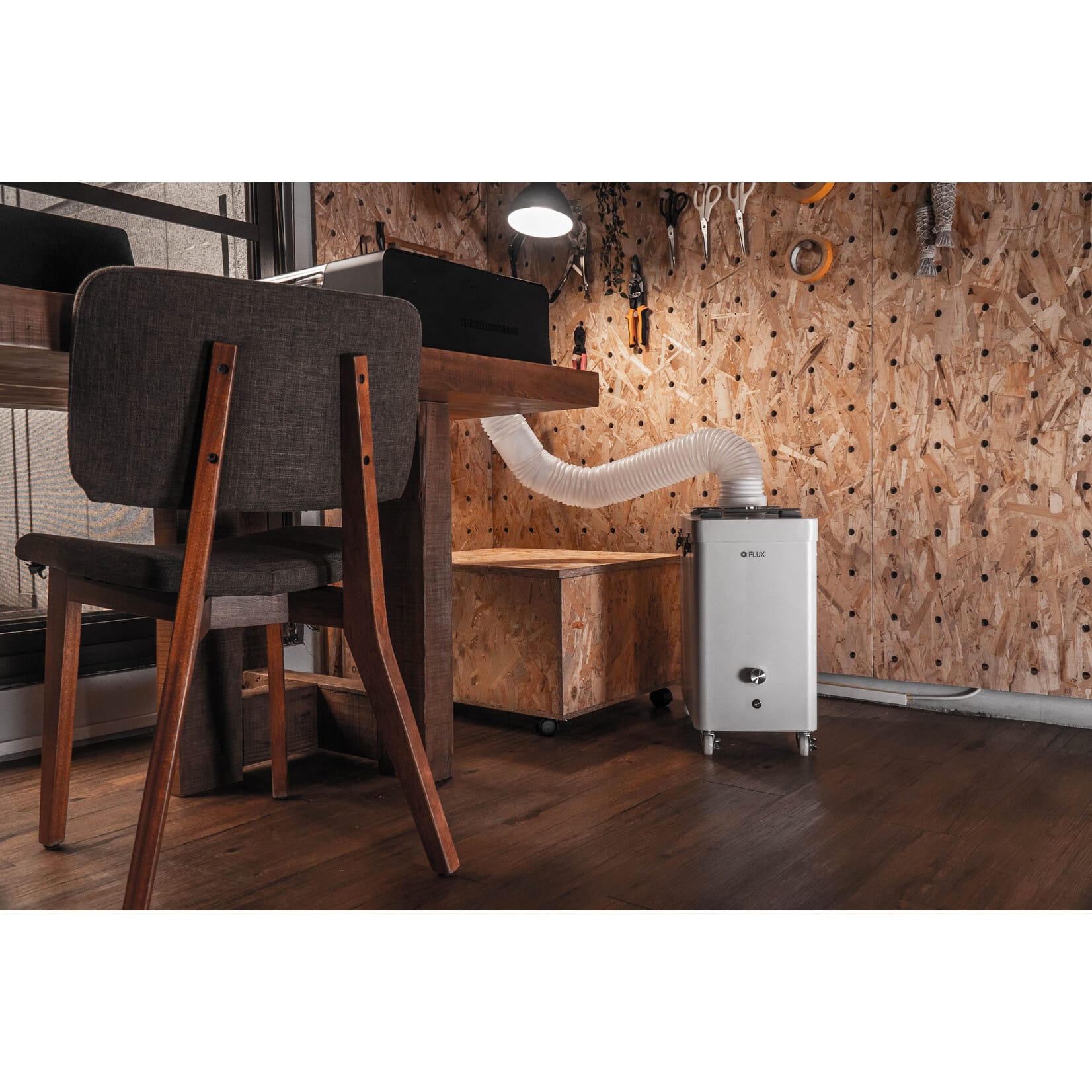 A FLUX Beam Air in a workspace, connected to a vent hose.