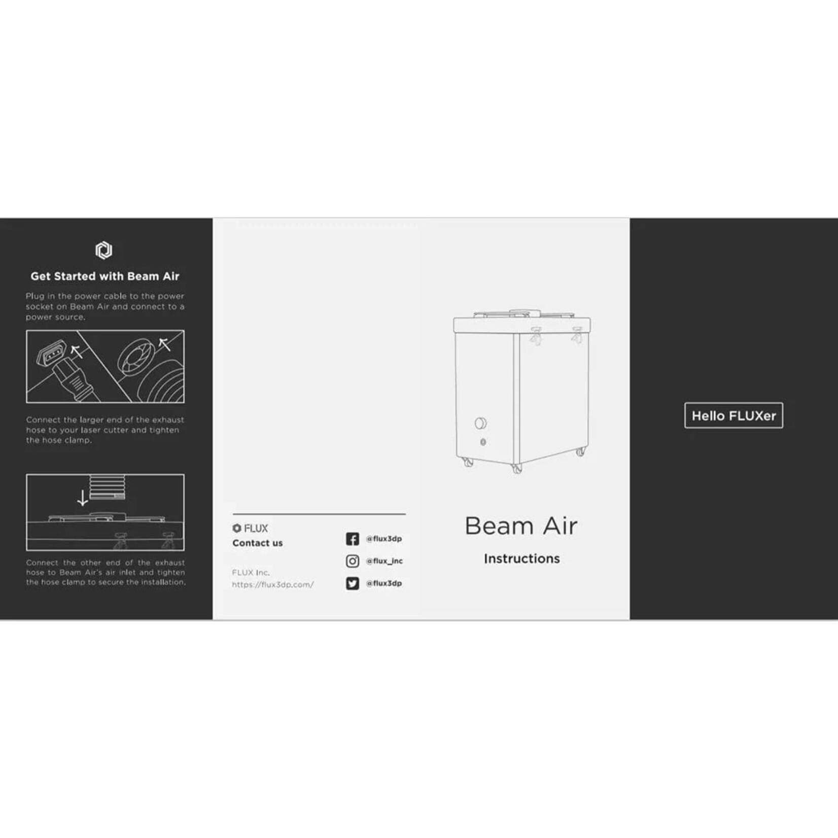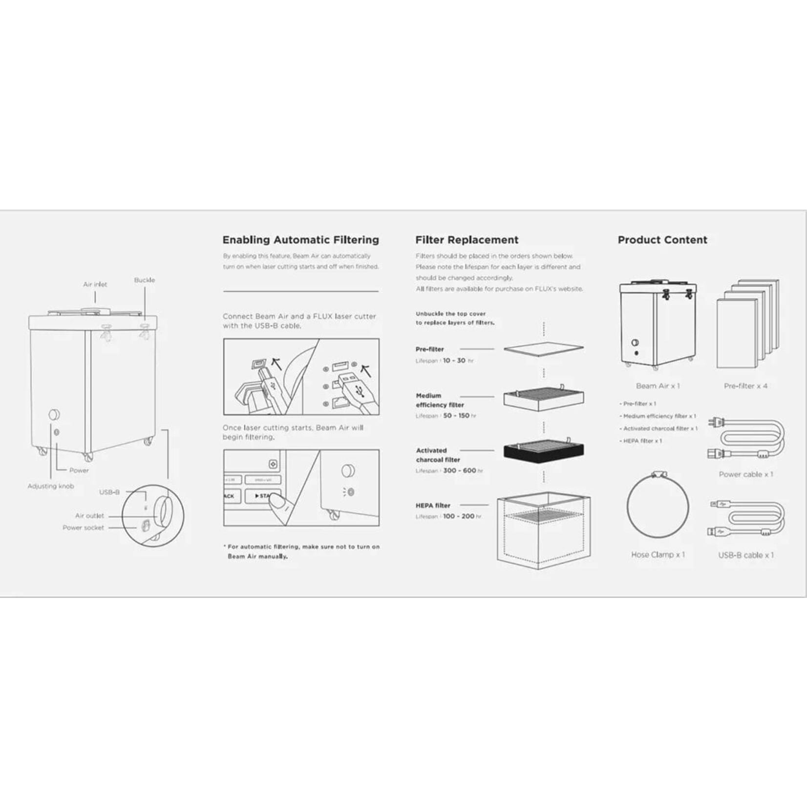 Če Beam Air povežete s katerim koli laserskim rezalnikom FLUX s kablom USB-B, se bo Beam Air samodejno vklopil, ko začnete z laserskim rezanjem, in izklopil, ko bo laserski rezalnik končal. Ni vam treba pomniti, kdaj ga vklopiti ali izklopiti.